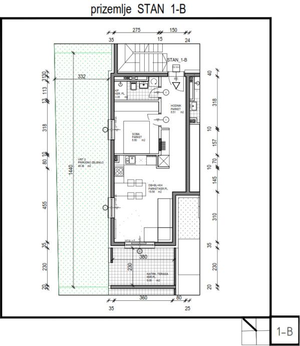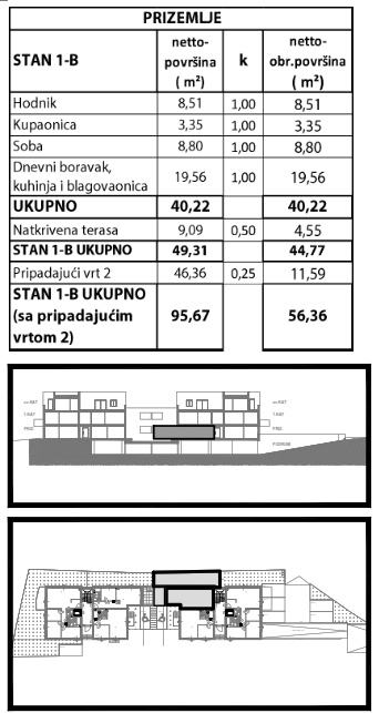 Stan 1-B ima 40,22 m2 neto stambene površine te dodatnu natkrivenu terasu od 9,09 m2 (obračunski 4,55 m2). Pripada mu i privatni vrt površine 46,36 m2 (obračunski 11,59 m2).