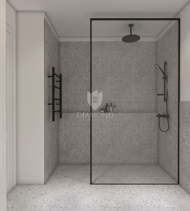 Ovaj stan nalazi se u prizemlju novogradnje i sastoji se od spavaće sobe, kupaonice te prostranog dnevnog boravka s kuhinjom i blagovaonicom, s izlazom na vlastiti vrt. Stan je opremljen visokokvalitetnom PVC stolarijom s troslojnim staklima, aluminijskim roletama na elektromotor, a za ugodnu temperaturu tijekom cijele godine brinu ''Mitsubishi'' klima uređaji i podno grijanje na struju s Wi-Fi termostatima. Elegantan izgled prostora dodatno ističu keramičke pločice ''Marca Corona''.