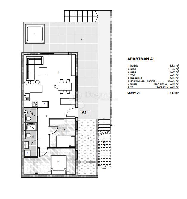 Netto površina stambenog prostora je 63,72 m², a brutto površina s vrtom i terasom iznosi 74,33 m².
