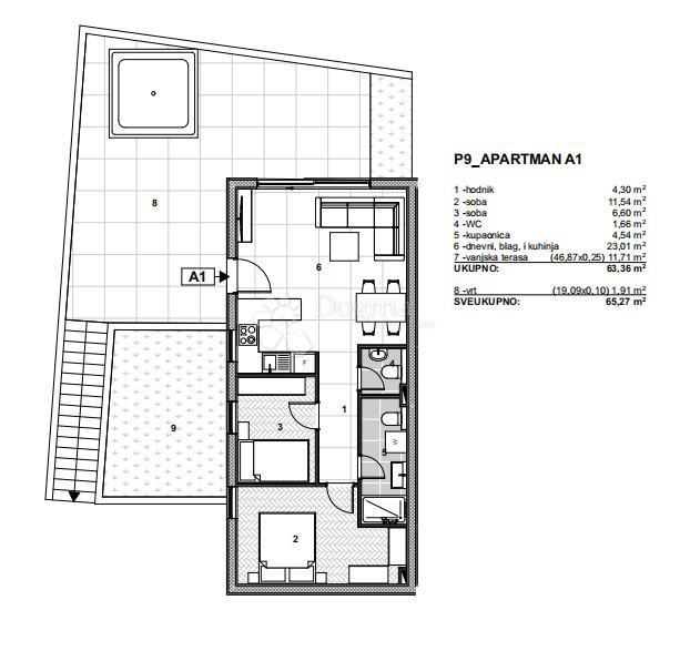 Netto površina stambenog prostora je 51,65 m², a brutto površina s vrtom i terasom iznosi 65,27 m².
