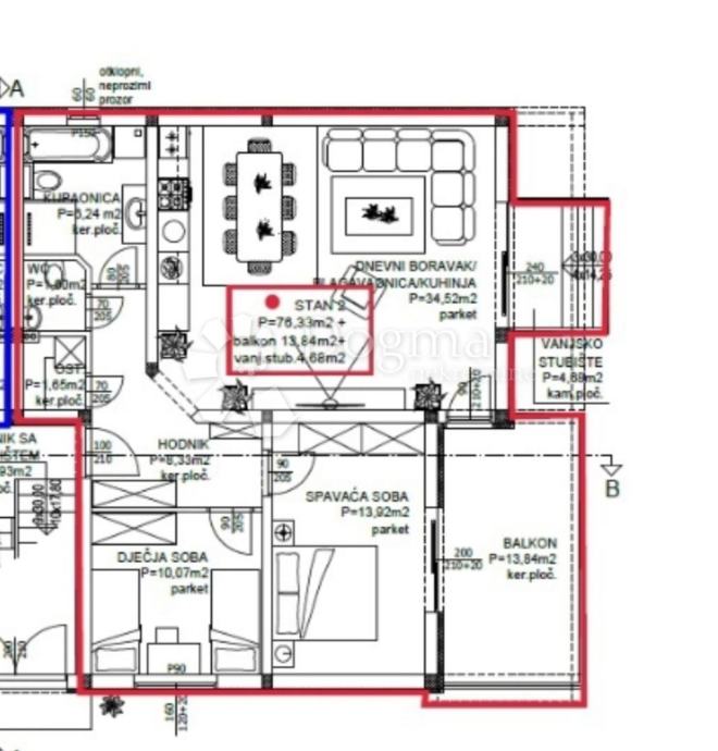 Stan ima 94,85 m2 i sastoji se od kuhinje, blagovaonice i dnevnog boravka koji čine jednu harmoničnu cjelinu koja je vanjskim stepeništem povezana sa vrtom od cca 80m2 koji pruža dovoljno prostoraza cijelu obitelj za zabavu na otvorenom.