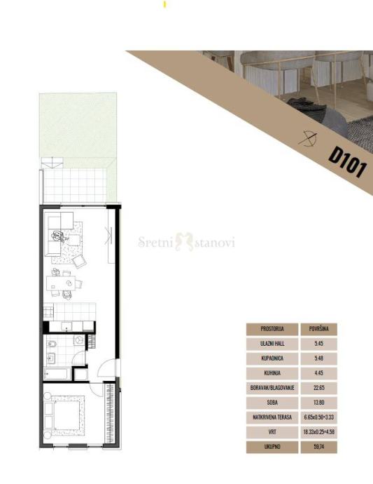 Stan 1SB+DB sa vrtom u prizemlju zgrade 59,74m2.