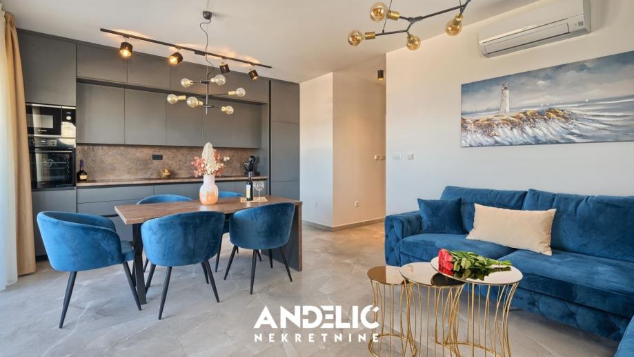 The apartment is located on the second floor of a smaller residential building, consists of three bedrooms, two bathrooms, one of which is part of the room, kitchen, dining room, living room, hallway, covered terrace of 16 m2, total area of 103 m2.