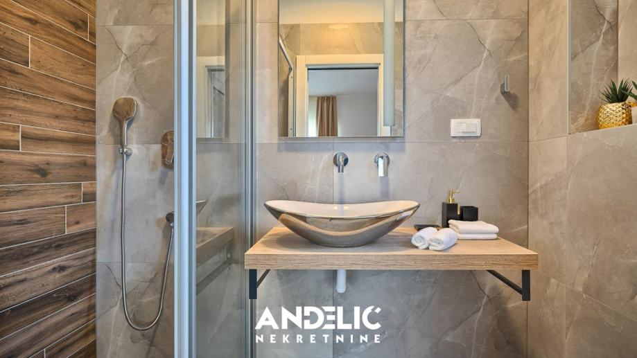 Stanu pripada dva parking mjesta te 87 M2 krovne terase, stan dijeli zajednički vanjski prostor sa bazenom 9 M x 4 M, tušom, ležaljkama.