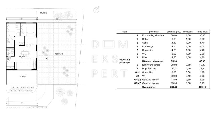 Grijana stambena površina stana iznosi 65.30 m², pripadci se obračunavaju po koeficijentima, a neto korisna površina stana sa svim pripadcima iznosi 108.45 m².