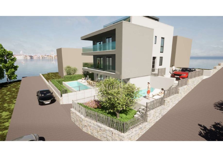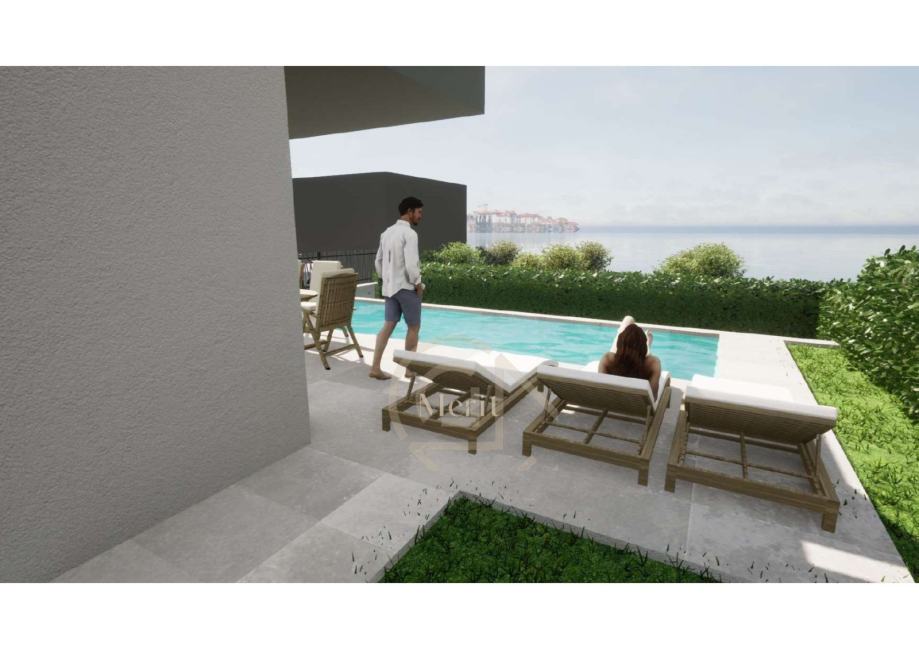 3 prostrane spavaće sobe 2 elegantne kupaonice s vrhunskim sanitarijama Prostrani dnevni boravak i blagovaonica s izlazom na terasuPrivatni vrt s bazenom – vaša osobna mediteranska oaza Garažno parkirno mjesto osigurano u cijeni Mir i privatnost – samo 3 stambene jedinice u zgradi Ekskluzivna lokacija – 100m od mora