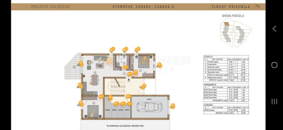 Stan S1 nalazi se u prizemlju i ima ukupnu površinu od 67,53 m2. Raspored uključuje dnevni boravak s kuhinjom i blagovaonicom, dvije spavaće sobe i kupaonicu te lođu od 7,25 m². Vrt i položaj u prizemlju pružaju osjećaj privatnosti i mira. Uz stan dolazi i spremište i parkirno mjesto