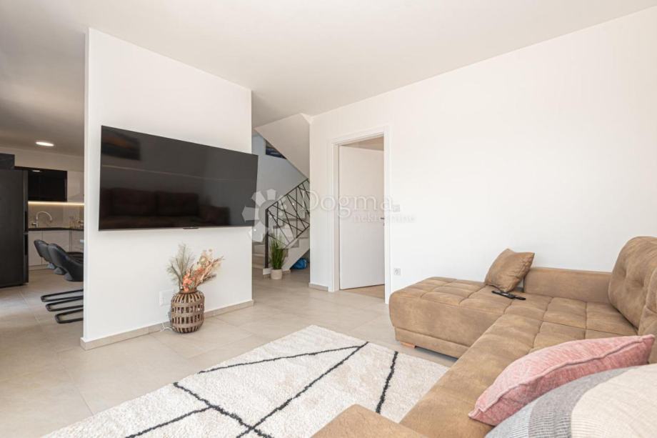 Ova moderna vila s pet soba i ukupnom površinom od 136 m2 raspoređenih na dva nivoa jugozapadne je orijentacije što omogućava potpuno uživanje u dugim sunčanim danima. Vila je moderno namještena i prodaje se sa svim namještajem, a proteže se kroz dvije etaže - prizemlje i kat.