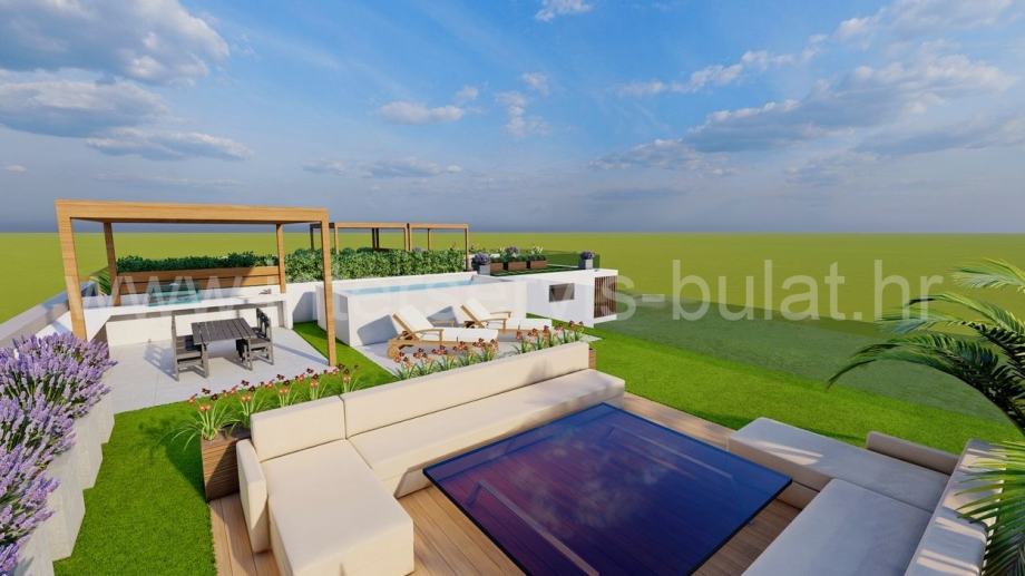 Zgrada je građena vrhunskim materijalima, podnim oblogama i sanitarijama, te će stan biti opremljen podnim grijanjem u kuhinji i kupaonicama, klimama u svakoj prostoriji, portafonom, protuprovalnim vratima, PVC antracit vanjskom stolarijom sa komarnicima i električnim roletama.