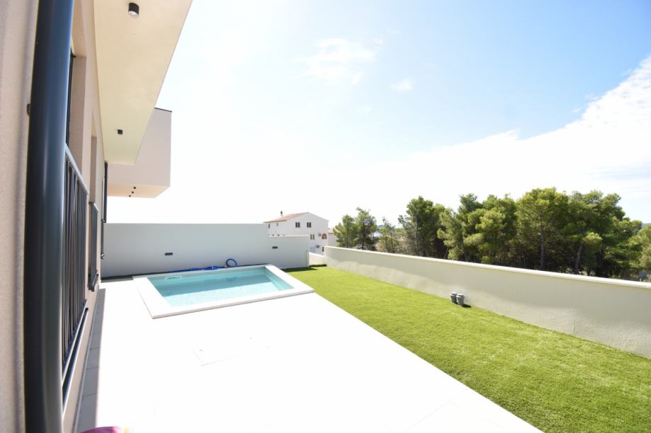 Okućnica stana iznosi 196,37 m2 s uređenim zelenim površinama te bazenom od 14,22 m2.