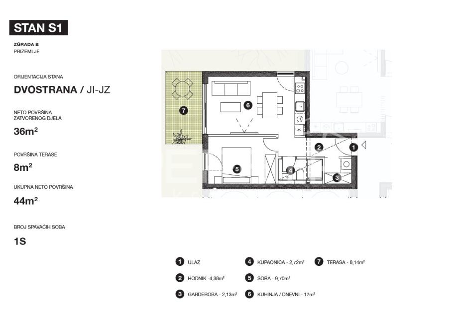 Smješten u prizemlju, sastoji se od jedne spavaće sobe, dnevnog boravka s kuhinjom, kupaonice, hodnika s garderobom, natkrivenom terasom i velikog vrta površine 140 m2.