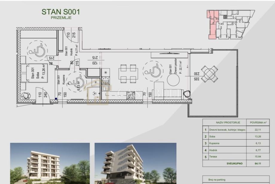 U ponudi je stan S001 u prizemlju moderne novogradnje na odličnoj lokaciji. Stan je projektiran i prilagođen osobama s invaliditetom, s prostranim hodnicima i širinom vrata koja omogućuju nesmetano kretanje u invalidskim kolicima.