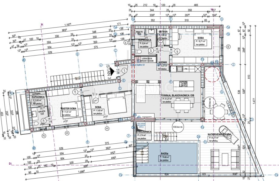 18 m2 s protustrujnim plivanjem, stan posjeduje i tri parkirna mjesta od kojih dva natkrivena