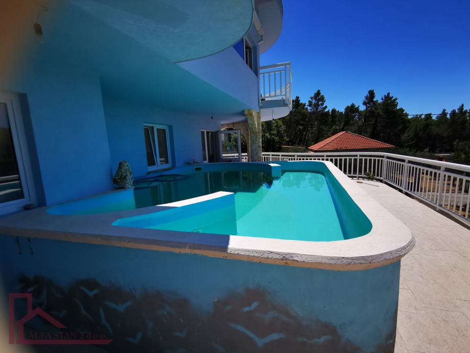Nalazi se na zemljištu površine 581 m2, a tlocrtno ima 188 m2 (suteren+prizemlje + 1 kat + prohodni krov) s 3 stambene jedinice, dvije garaže i konobom.