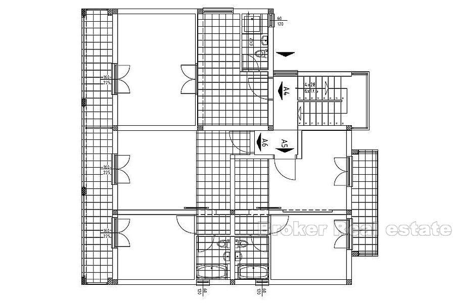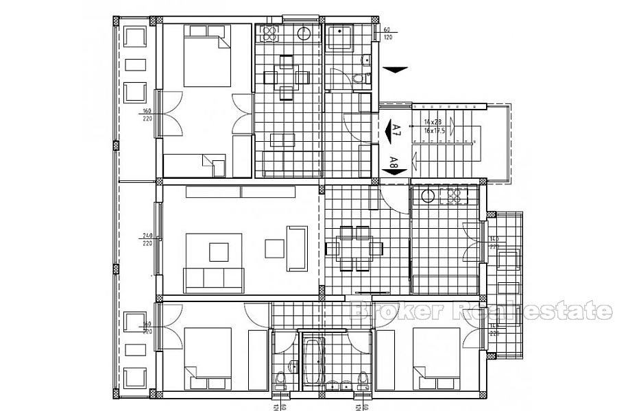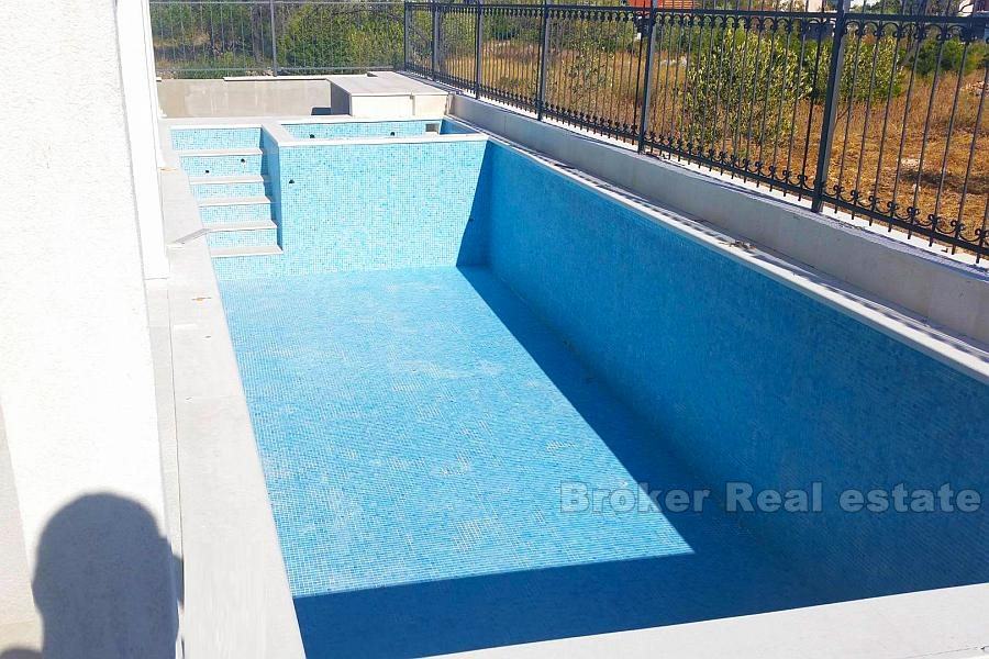 Prodaje se novoizgrađena kuća, 100m udaljena od plaže s ukupno 7 apartmana (45m2) i jednim stanom 95m2 u mirnoj uvali turističkog mjesta u blizini Trogira. Kuća je ukupne površine 450m2 s otvorenim stubištem i balkonima. Svaki apartman ima balkon i zaseban ulaz. Okućnica je 550m2 sa vrtom, bazenom i jacuzzijem.