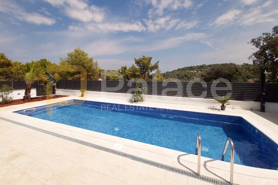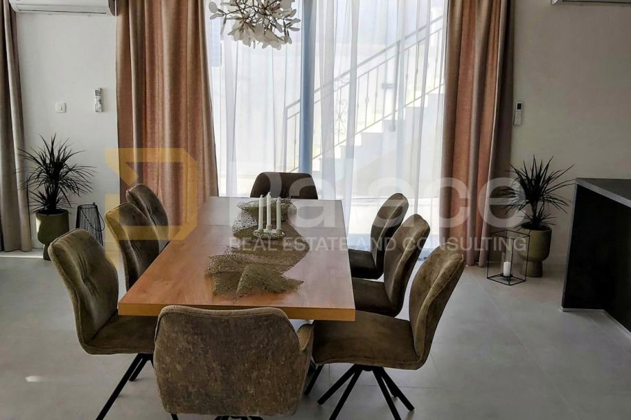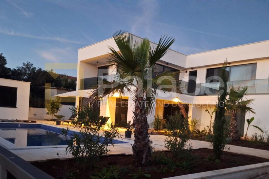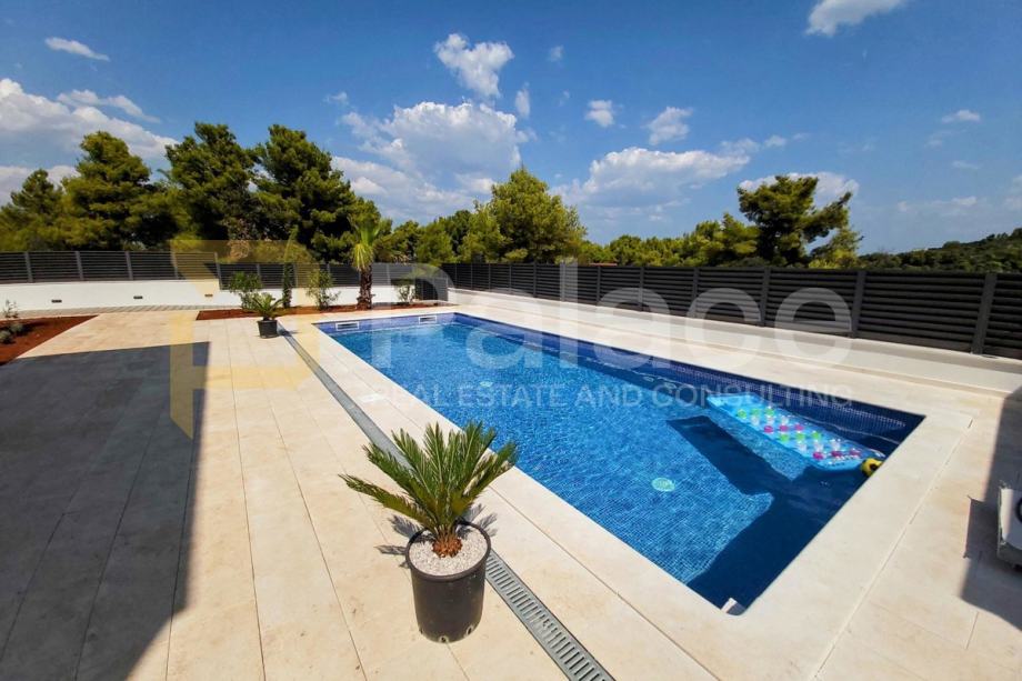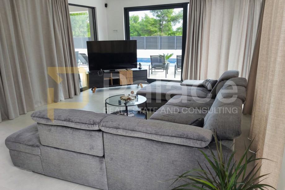 Wellness je također klimatiziran zasebnom mono jedinicom klime isto snage 3,5 kW.U vrtu je instalirano navodnjavanje biljaka.Nekretnina ima video nadzor sa 4 kamere i alarmni sustav sa senzorima pokreta, dima i vode.U cijelosti je vila opremljena standardom za kategorizaciju 4 zvjezdice. Svaka od 4 sobe ima bračne krevete, noćne ormariće, lampe, stolić sa 2 fotelje, po mjeri napravljenim ugradbenim ormarima, staklenim stijenkama sa zavjesama i roletama, izlazom na balkon, svaka soba ima svoj WC sa walk-in tuševima sa staklenom stijenkom, grijanjem i ostalim sanitarijama. Uz 3 sobe na katu i 1 u prizemlju, u prizemlju je dodatni gostinjski wc, te kuhinja, blagovaona i dnevni boravak, te sprema ispod skala. Kuhinja je dizajnerska (DanKuchen), opremljena je s 2 hladnjaka, modernom touch pločom i pećnicom, napom, mikrovalnom, tosterom, sokovnikom, mikserom, posuđem, mašinom za suđe. Ispod skala je prostorija sa mašinom za robu i sušilicom za robu.Na ulazu je vanjski stol sa 10 stolica kao vanjska blagovaona i roštilj, idealno za druženje veće skupine.Zvučnici su montirani van objekta u dijelu za druženje i unutar same vile.Dnevni boravak je opremljen velikim kutom za sjedenje koji se može pretvoriti u ležaj za dodatne 2 osobe, stakleni stol, TV 65" Philips postavljen na velikom regalu, fiksni telefon. Kuća ima Internet. U jednoj od soba se također nalazi TV Samsung.Vrt je osmišljen od strane stručnjaka za hortikulturu sa više od 100 zasađenih biljaka, varirajući od tropskih kao što je nekoliko vrsta palmi i banana, do mediteranskih kultura kao što su limuni, čempresi, oleandar, ružmarin, lavanda, itd.Cijela parcela je ograđena zidom sa kamenim poklopnicama i pocinčanom ogradom.Unutarnje skale su od kamena dolita, a vanjske od kamena plano, kao i kamenom popločanih 250ak m2 okućnice vile.