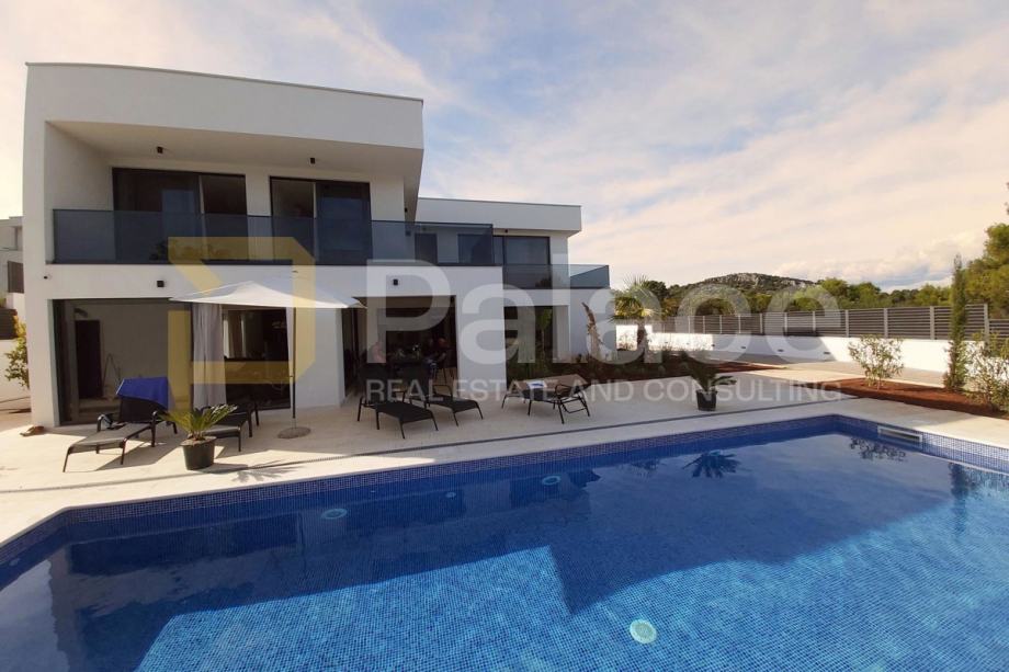 Na prodaju je ova moderna vila ravnog krova, napravljena od najkvalitetnijih materijala.Vila i prateći objekti su u cijelosti napravljeni od armiranog betona, a opremljeni su sa modernim i kvalitetnim namještajem.Nekretnina se nalazi u Rogaču na otoku Šolti, 80ak metara od mora i 150ak metara od centra mjesta, u mirnom dijelu naselja.Vila je napravljena na zemljištu površine 966 m2 sa dodatnih 67 m2 pristupnog puta.