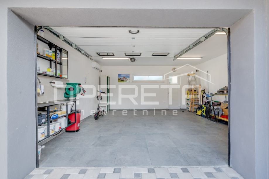 U prednjem ulaznom dvorištu je osigurano parkiralište za 4 automobila, kao i garaža za 2 vozila. Garaža je zapravo osmišljena kao pomoćni objekt s gostinjskim toaletom, sve ugrađeno u vilu, a dodatno otvoreno sa stražnjim dvorištem kako bi ljetna kuhinja i boravak bio komforniji.