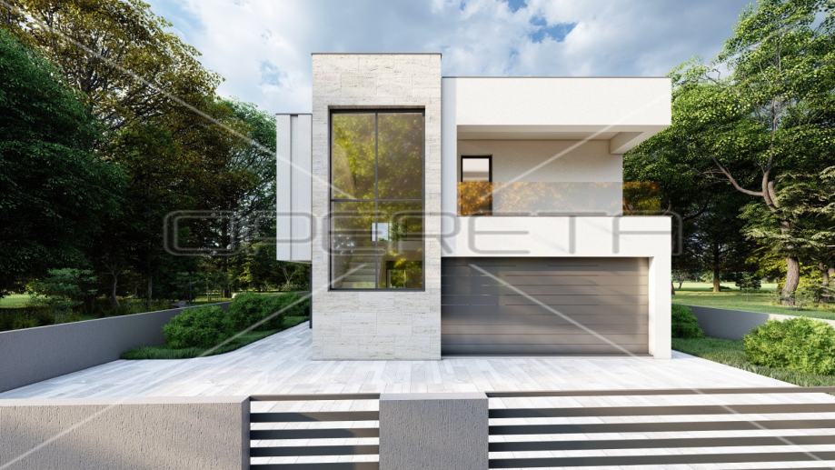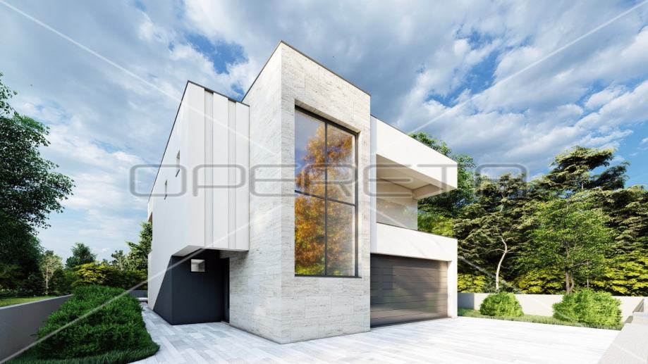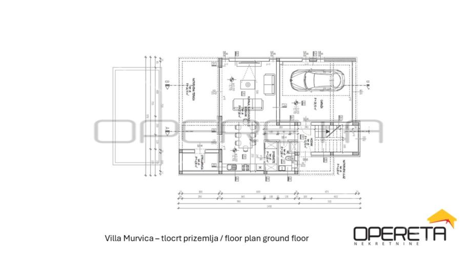 Prizemlje čine dnevni boravak, blagovaona i kuhinja površine 40 m2 - veliki prozračni prostor sa puno svjetla. Klizna stijena koja se pruža gotovo cijelom dužinom vanjskog zida briše granicu unutarnjih i vanjskih prostorija. Uz natkrivenu terasu površine 24 m2 dolazi se do vanjskog bazena sa sunčalištem.