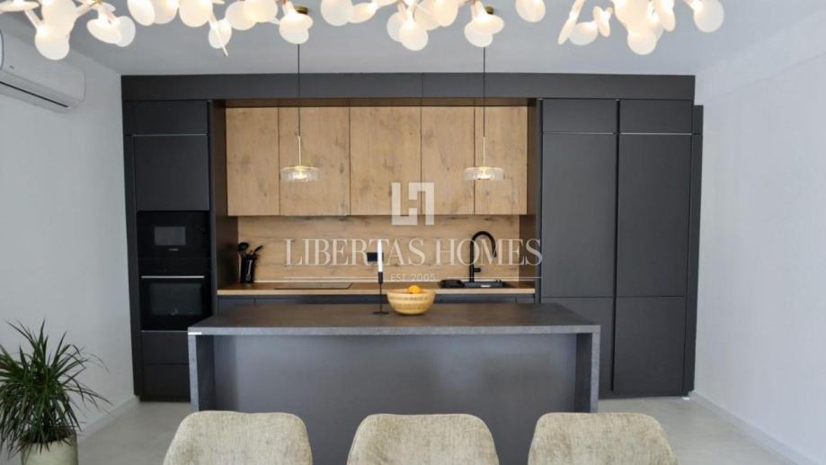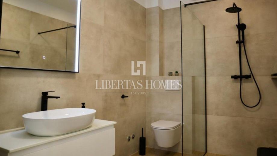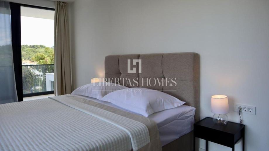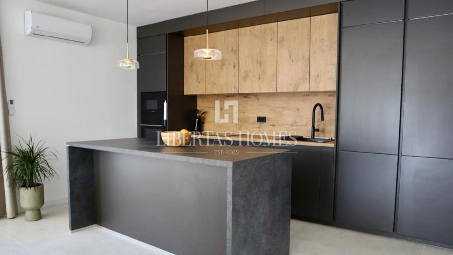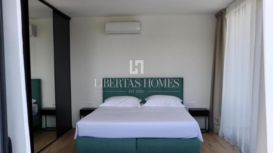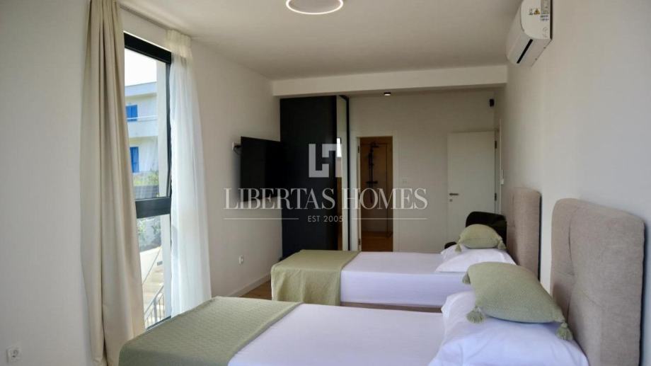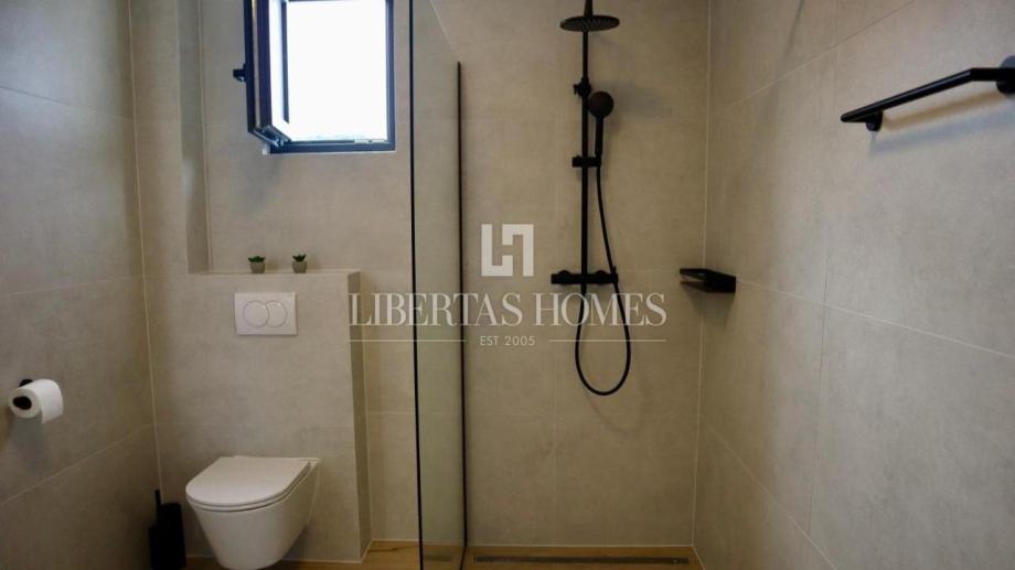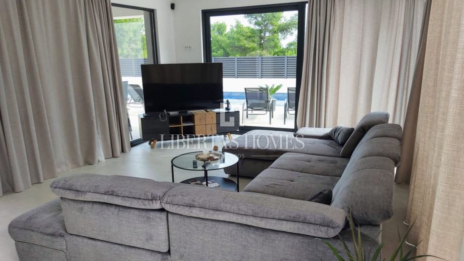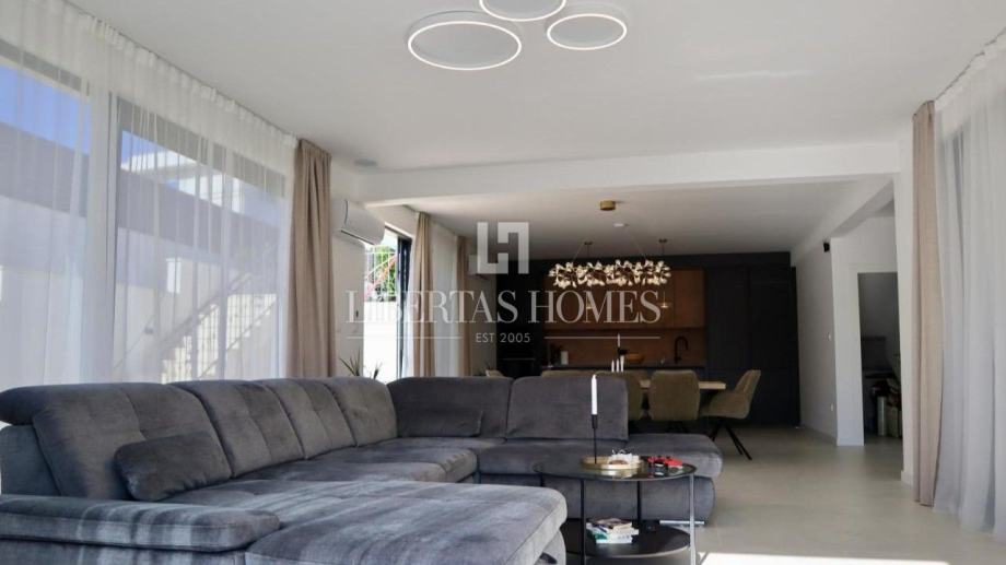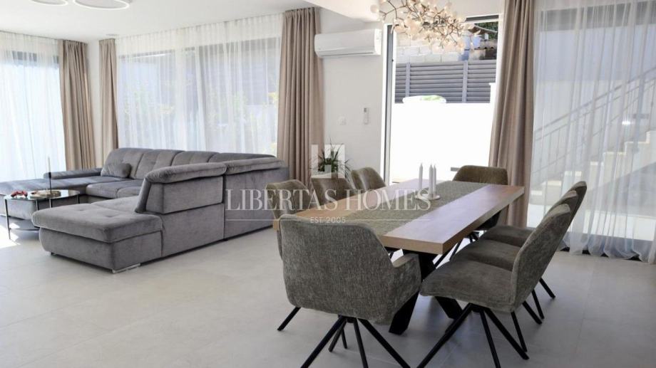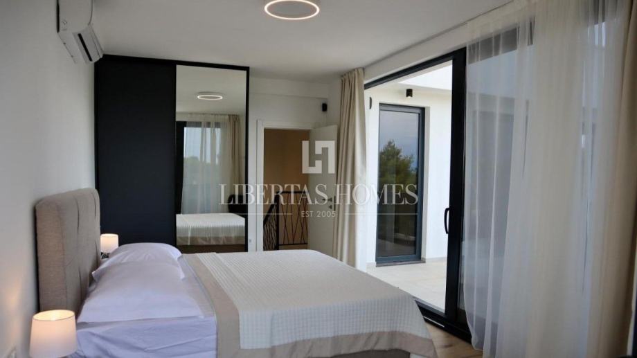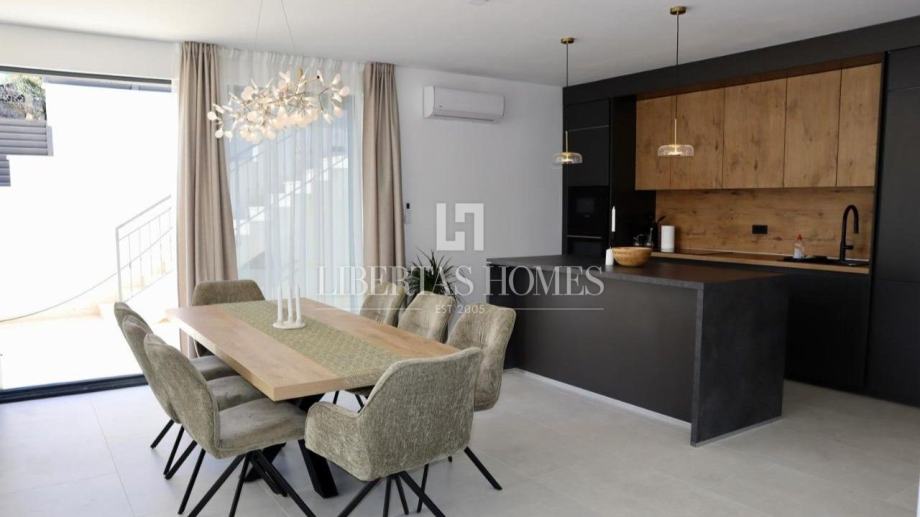 Unutrašnjost vile pažljivo je osmišljena kako bi omogućila maksimalnu udobnost i funkcionalnost. Prizemlje nudi prostranu spavaću sobu s vlastitom kupaonicom, dodatni gostinjski toalet, praktičnu ostavu te moderno opremljenu kuhinju koja se stapa s blagovaonicom i dnevnim boravkom. Velike staklene stijene omogućuju obilje prirodnog svjetla i otvaraju pogled na vrt i bazen. Na katu su smještene tri prostrane spavaće sobe, svaka s privatnom kupaonicom i izlazom na balkon, s kojeg se pruža očaravajući pogled na morski pejzaž.