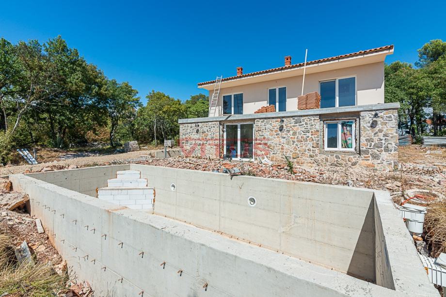 Novoizgrađena vila s bazenom, ukupne stambene površine 343,71 m2, nalazi se u široj okolici Malinske. Sastoji se od suterena, prizemlja, prvog kata i visokog potkrovlja. U suterenu se nalazi konoba veličine 30 m2. U prizemlju su smještena dva dnevna boravka s kuhinjama, tri spavaće sobe, dvije kupaonice, teretana i sauna. Na prvom katu su smještene dvije spavaće sobe, dnevni boravak s kuhinjom, kupaonica, toalet, terasa i balkon. U viskom potkrovlju se nalazi knjižnica i balkon. Na prostranoj, uređenoj okućnici se nalazi privatni teniski teren, bazen sa sunčalištem, i prostor za komforno parkiranje više vozila. Kvalitetna gradnja i oprema, PVC stolarija. Nekretnina je trenutno u izgradnji, završetak radova je planiran za 2023.g. U mirnom dijelu otoka, udaljena od mora 6000 m!