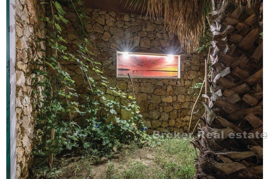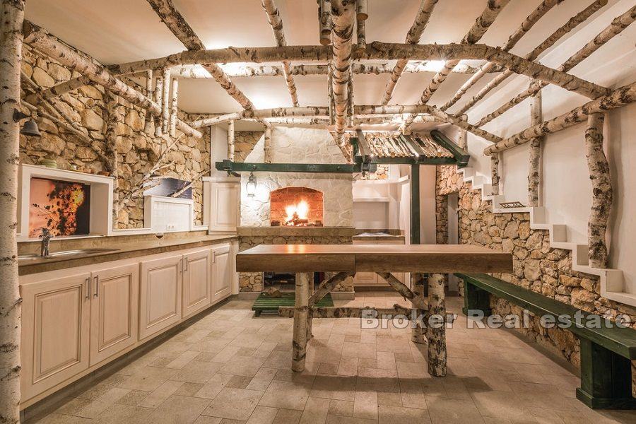 Vila je okružena ručno obrađenim kamenim zidom, a na njenoj kultiviranoj okućnici popločanoj kamenom u kombinaciji s mediteranskim biljem (palme,ružmarini,lavanda…) smjestio se veliki bazen u svojoj površini od 50m2, opremljena ljetna vanjska kuhinja s pokretnim šankom i roštiljom, kao i dodatni prostor od 70m2 predviđen kao hobby prostor, prostor za zabavu, rekreaciju i uživanje.