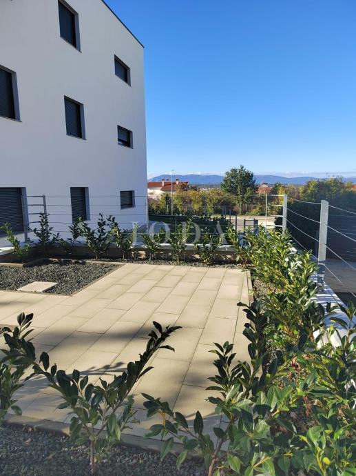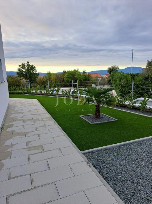 Apartman se nalazi na prvom katu. Stambena površina iznosi 72m2, a sastoji se od ulaznog prostora, dnevnog boravka, kuhinje i blagavaonice, kupaonice, dvije spavaće sobe te izlaza na natkrivenu terasu s prekrasnim pogledom na more. Apartmanu pripada prostor u prizemlju, iste kvadrature i rasporeda. Nekretnini pripada i 125m2 okućnice te dva parkirna mjesta. U izgradnji su korišteni najkvalitetniji materijali kao što su keramičke podne obloge, staklene stijene i PVC stolarija. Useljenje je predviđeno za veljaču 2023. godine.