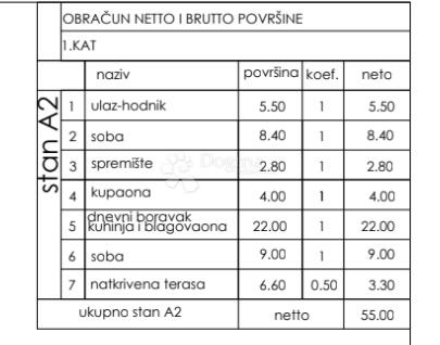 Stan neto površine 55 m² funkcionalnog je i odlično iskorištenog rasporeda te se sastoji od dnevnog boravka s kuhinjom i blagovaonicom, dvije spavaće sobe, kupaonice, hodnika te loggie koja pruža dodatni komfor i ugodan vanjski prostor za opuštanje.