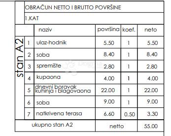 Stan neto površine 55 m² funkcionalnog je i odlično iskorištenog rasporeda te se sastoji od dnevnog boravka s kuhinjom i blagovaonicom, dvije spavaće sobe, kupaonice, hodnika te loggie koja pruža dodatni komfor i ugodan vanjski prostor za opuštanje.