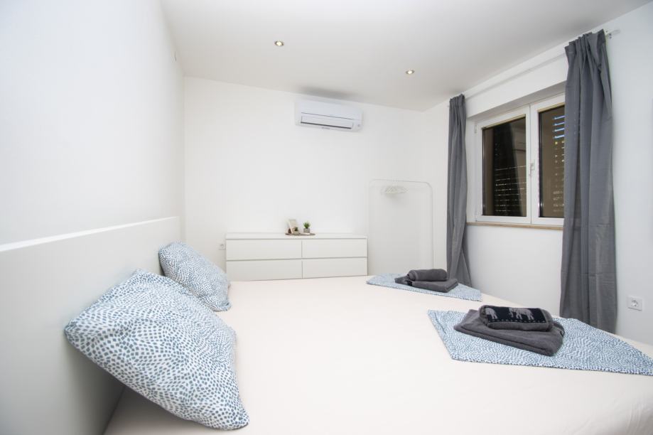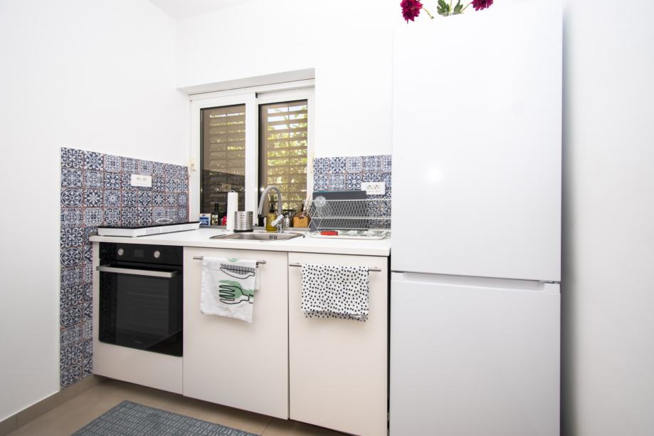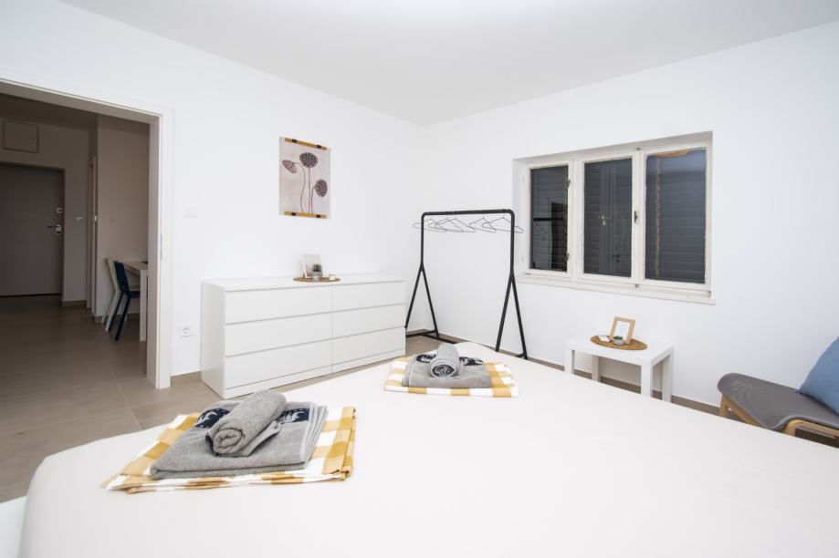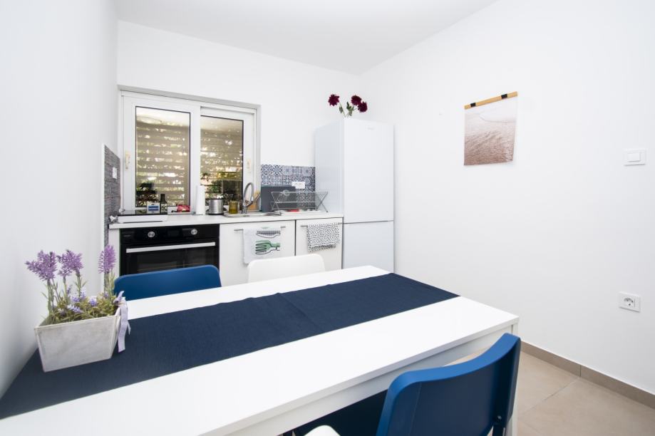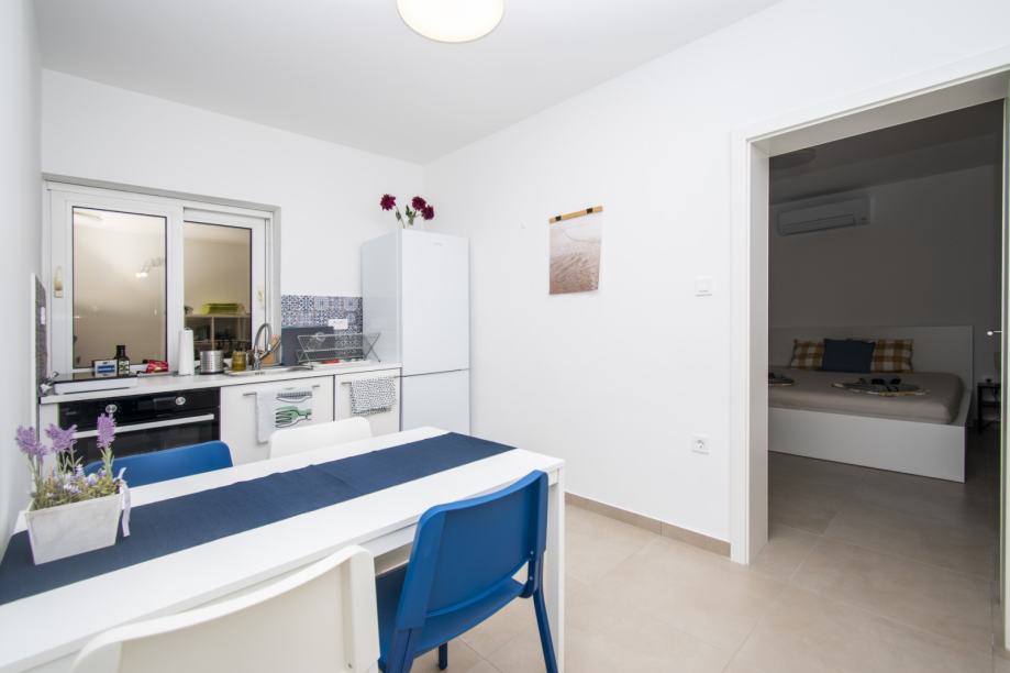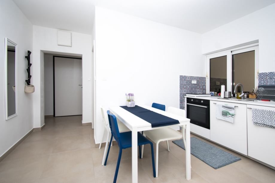 Sastoji se od hodnika, kupaonice, wc-a, kuhinje s blagovaonicom i dvije prostrane spavaće sobe.