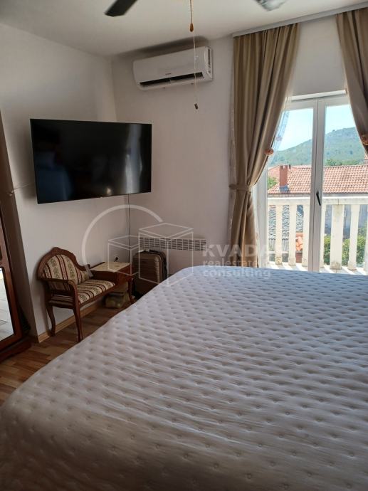 Komforan stan sa garažom i balkonom smješten je u prekrasnoj kamenoj kući koja je locirana uz glavni trg Gornjeg Humca, najvišeg mjesta na otoku Braču, nastalog na 500m nadmorske visine, pa njegove skladne kamene kuće i uličice okružene zelenilom odišu svježinom i mirom.