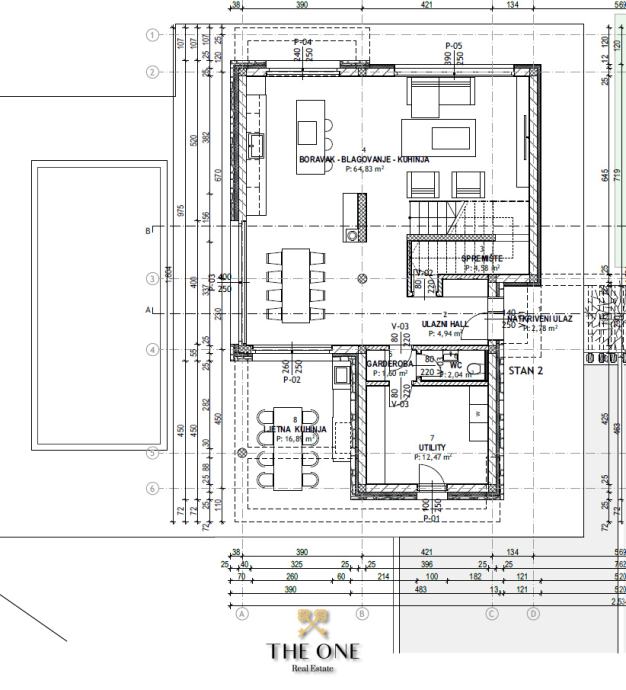 Prizemlje očarava prostranim otvorenim konceptom koji obuhvaća kuhinju, blagovaonicu i dnevni boravak, savršeno povezane s natkrivenom terasom, stvarajući idealno mjesto za uživanje u toplim ljetnim večerima. Tu su također toalet, garderoba i tehnička soba-praonica.