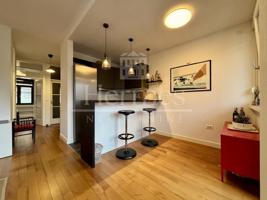 Stan je kompletno adaptiran 2020. godine, a interijer je pomno uređen, te opremljen modernom kuhinjom s aparatima, perilicom posuđa, perilicom rublja, televizorom, protuprovalnim vratima, PVC stolarijom s roletama i komarnicima, klima uređajem, Liebherr hladnjakom i ostalim aparatima.
