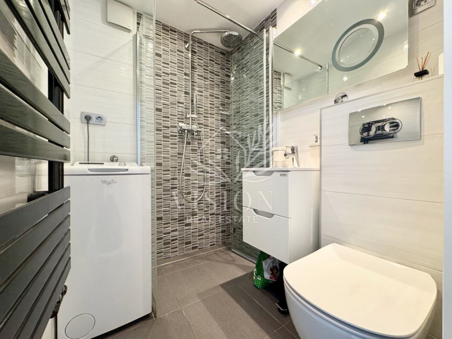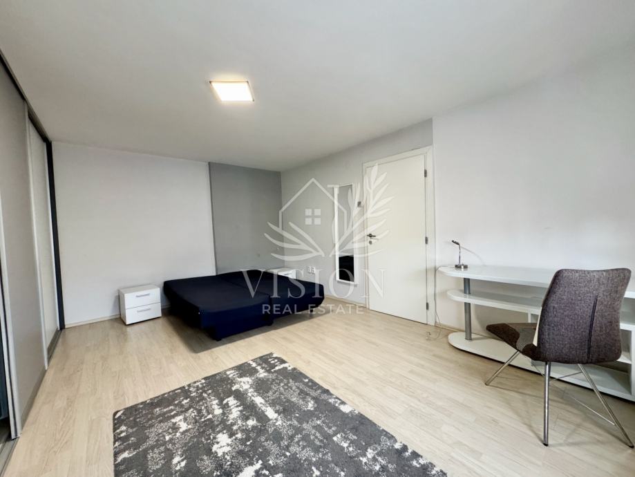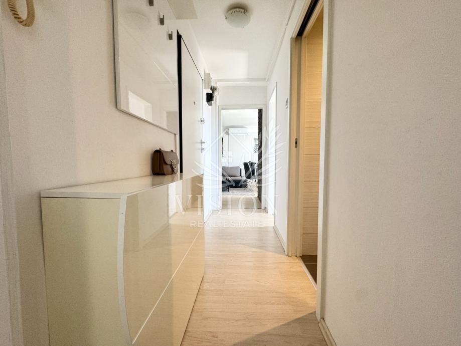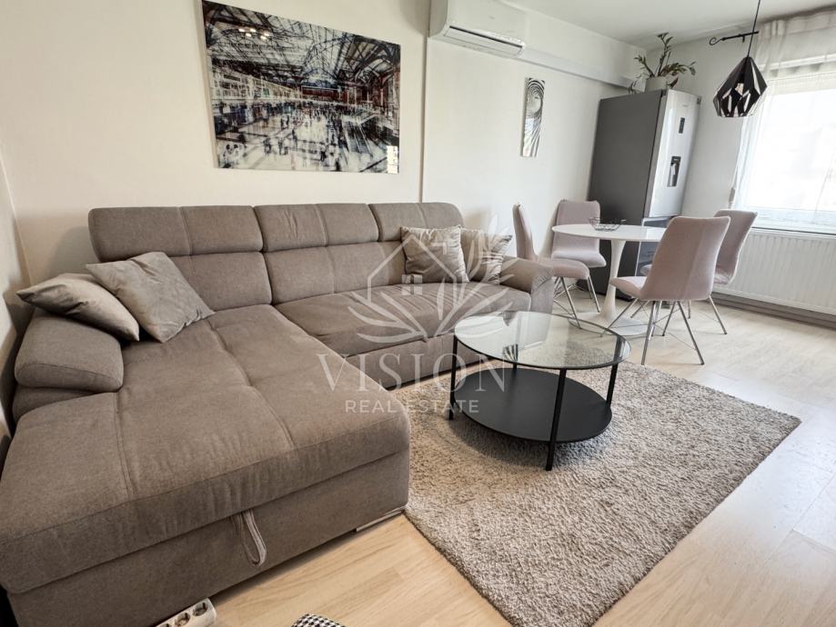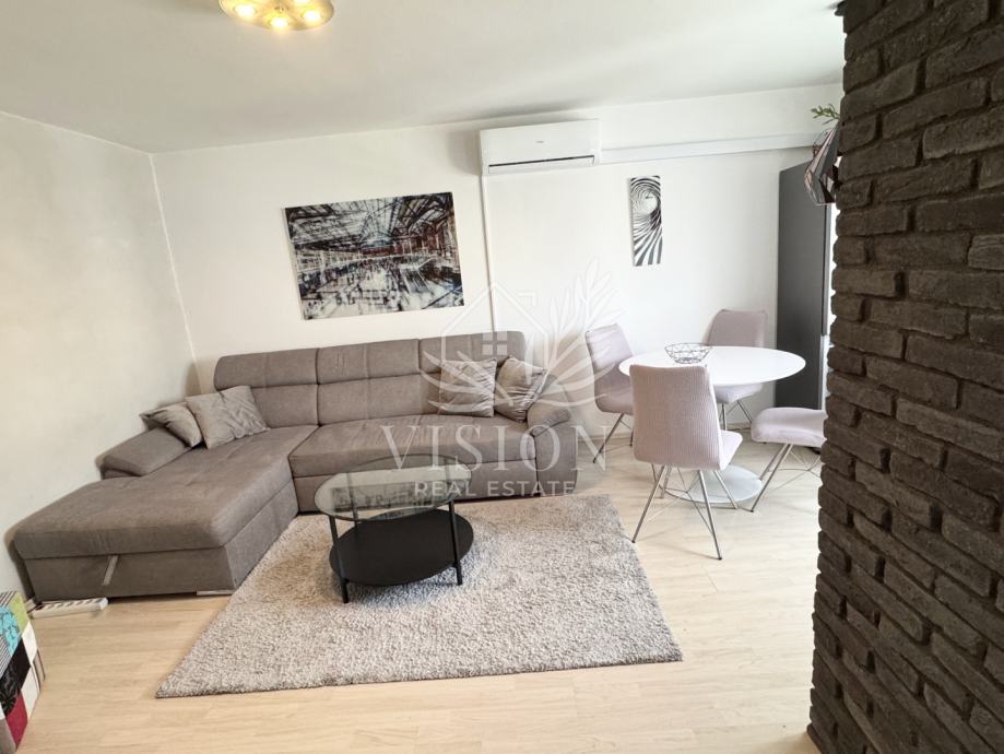 Stan ima protuprovalna vrata i daljinski upravljivo grijanje i hlađenje. Grijanje je etažno plinsko centralno i novi kondenzacijski bojler je ugrađen 2024. godine. Dnevni boravak sadrži kutnu garnituru na razvlačenje i klima uređaj. U blagovaonici su stol i 4 stolice te hladnjak sa zamrzivačem. U kuhinji se nalaze perilica posuđa, pećnica, štednjak, sudoper i napa. Na balkonu se nalazi mala ostava te stol i 2 stolice. Kupaonica je opremljena kvalitetnim sanitarijama te sadrži perilicu za rublje. U spavaćoj sobi nalazi se veliki ugradbeni ormar, i udobni kauč na razvlačenje, te radni stol. U podrumu se nalazi ostava od 2 m2 i zajednička prostorija za bicikle.