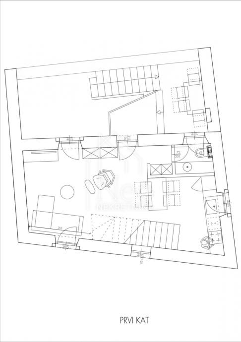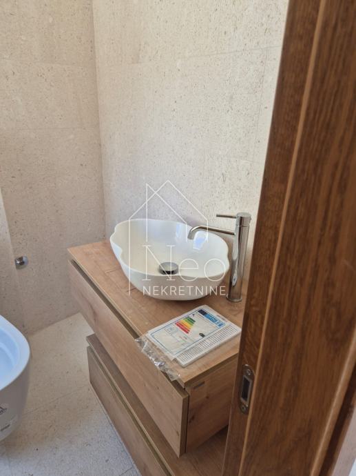 Na prvom katu je dvoetažna stambena jedinica koja na prvom katu ima kuhinji i dnevni boravak te WC. Drvenim stepenicama dolazimo na drugu etažu gdje su dvije spavaće sobe ( jedna s vlastitom garderobom) i kupaonica. Stan je neto površine 64m2 i terasa 8,80m2.
