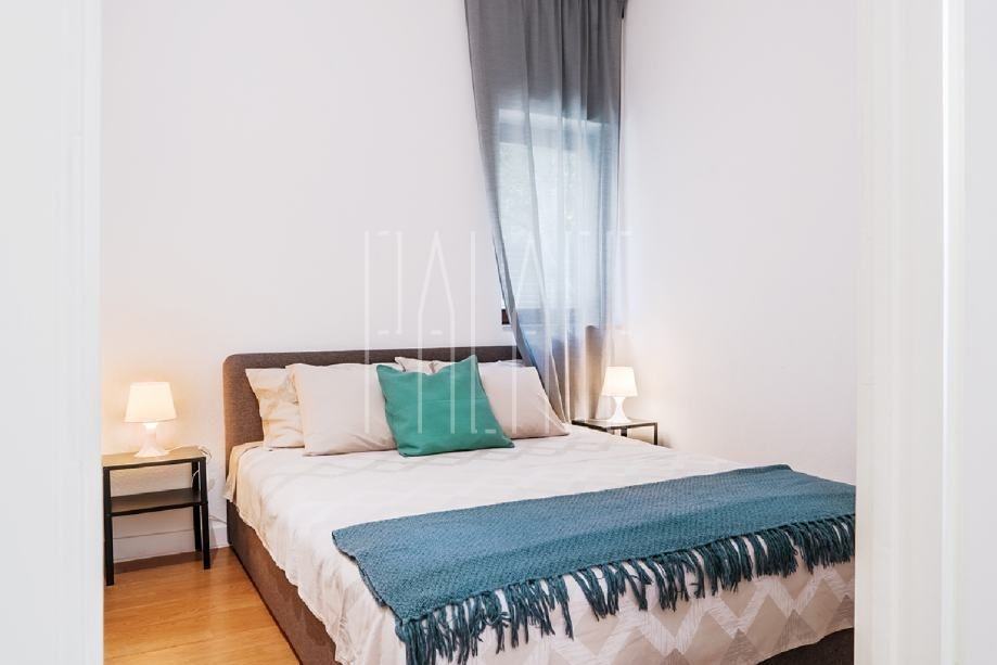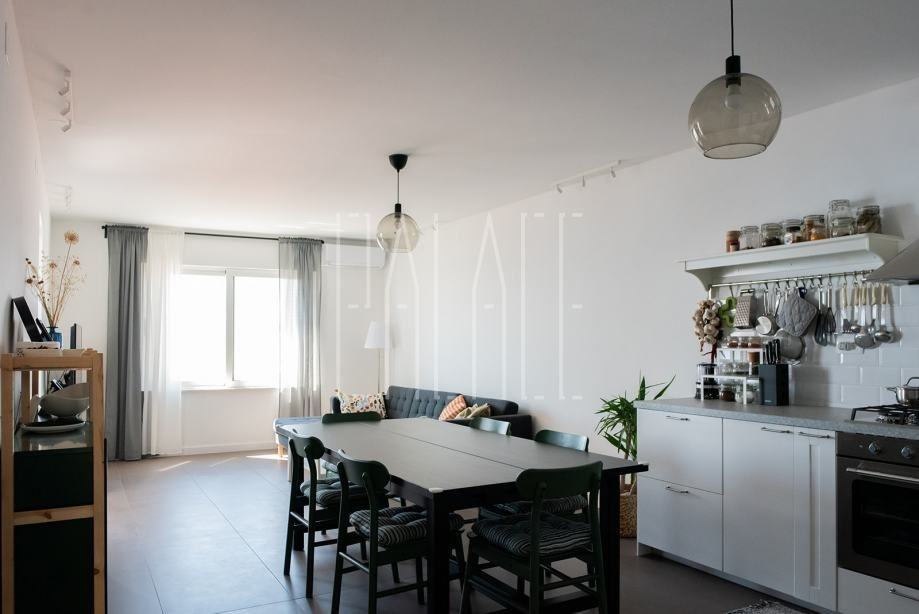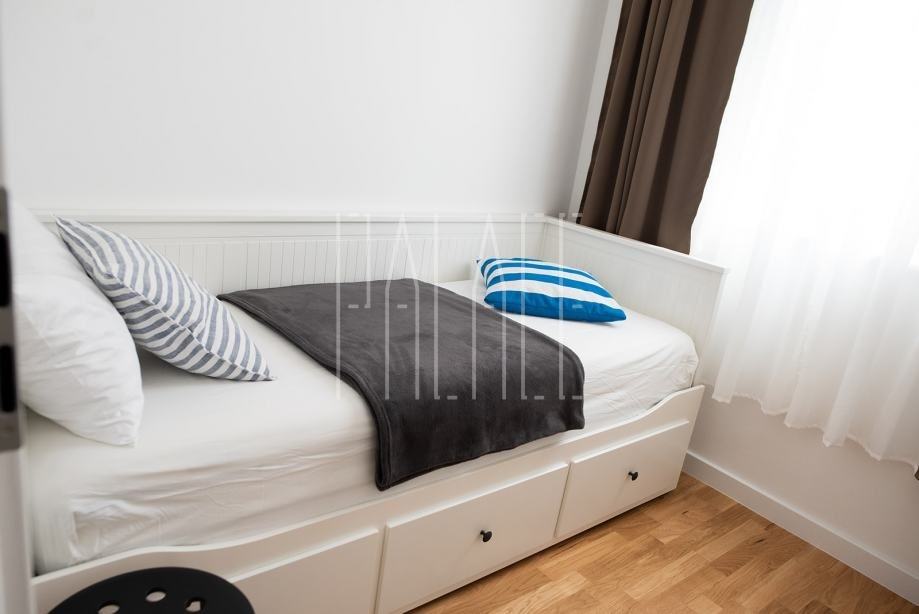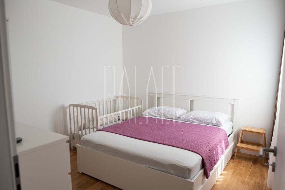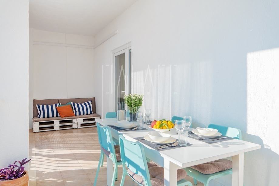 Na prvom katu smješten je stan od 107m2, sastoji se od ulaznog hodnika, tri spavaće sobe, dvije kupaonice, kuhinje s blagovaonicom, dnevnog boravka s izlazom na prostranu loggiu s koje se pruža prekrasan panoramski pogled na more i otoke. Stan je u potpunosti nov, namještaj, kuhinja, sanitarije, pločice itd. te je opremljen i električnim podnim grijanjem.