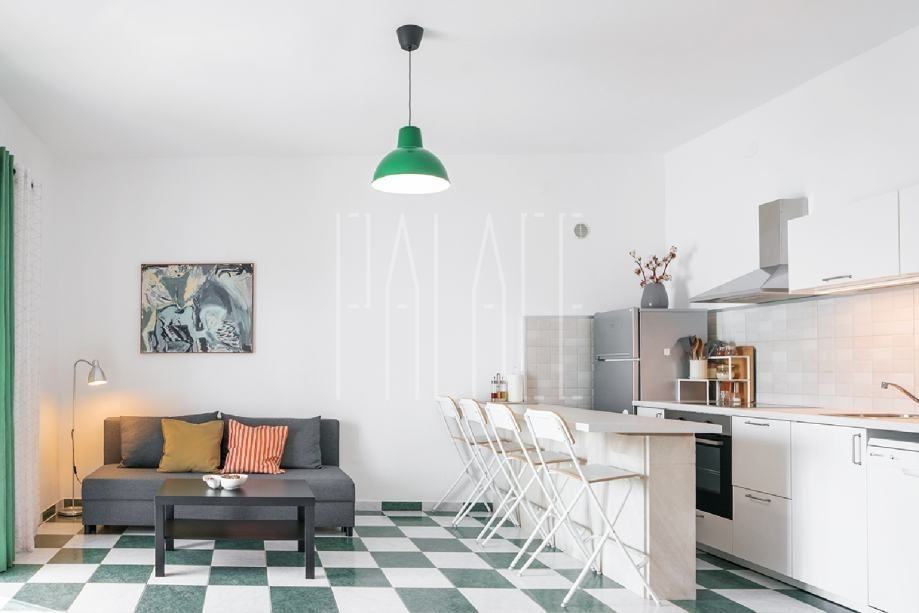 Jednosobni apartman od 45m2 se sastoji od kuhinje s dnevnim boravkom, hodnika, spavaće sobe i kupaonice.Dvosobni apartman od 60m2 se sastoji od kuhinje s blagovaonicom, dnevnog boravka. dvije spavaće sobe i kupaonice.Oba apartmana imaju pripadajuće terase i odvojene ulaze.Svi prostori su opremljeni klima uređajem.