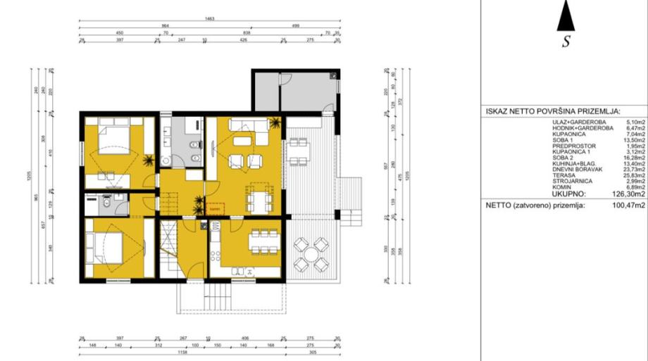 Kuća se sastoji od prizemlja u kojem je smješten komforan stan površine 126,30 m2, a sastoji se od ulaznog hodnika i predsoblja s garderobama, 2 spavaće sobe, 2 kupaonice, kuhinja s blagovaonicom i dnevnim boravkom koje imaju izlaz na istočnu zatvorenu lođu s pogledom na zeleni vrt i bazen. U prostoru lođe se nalazi još jedan wc.