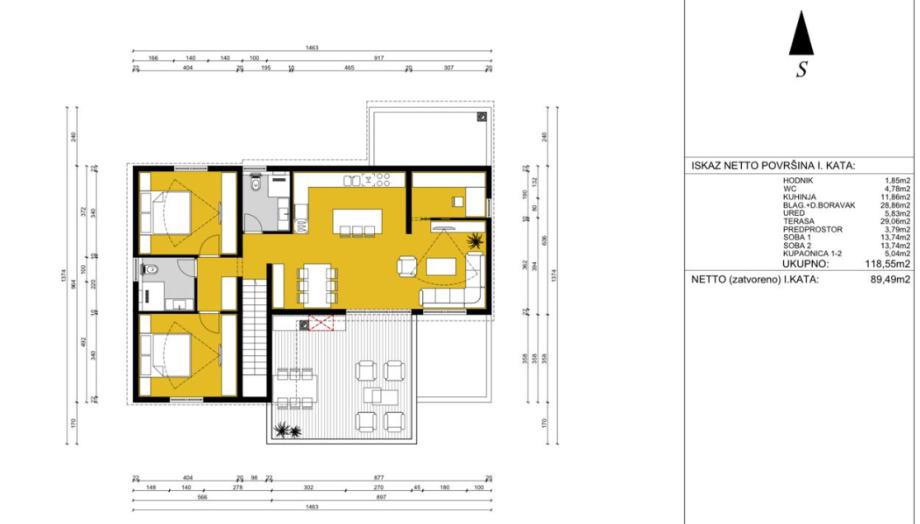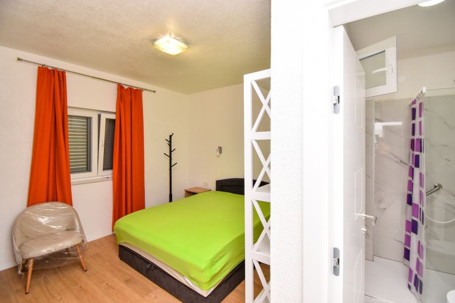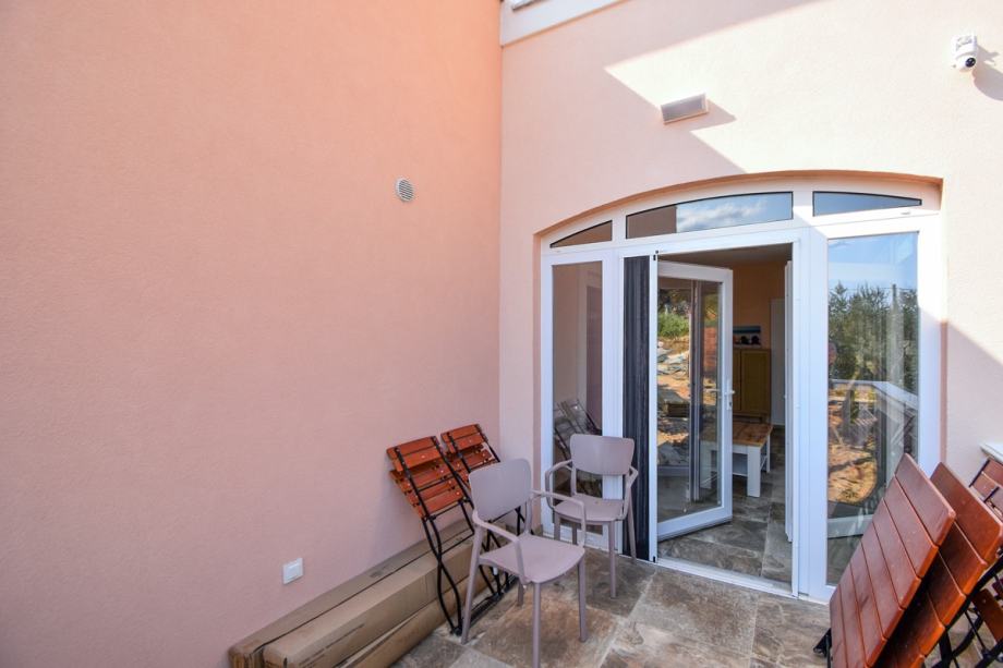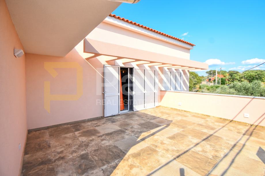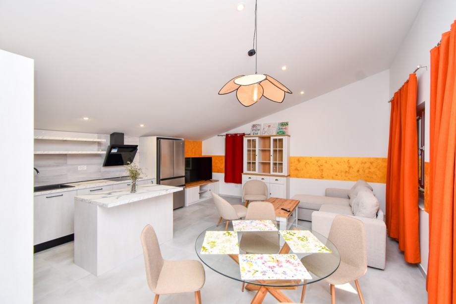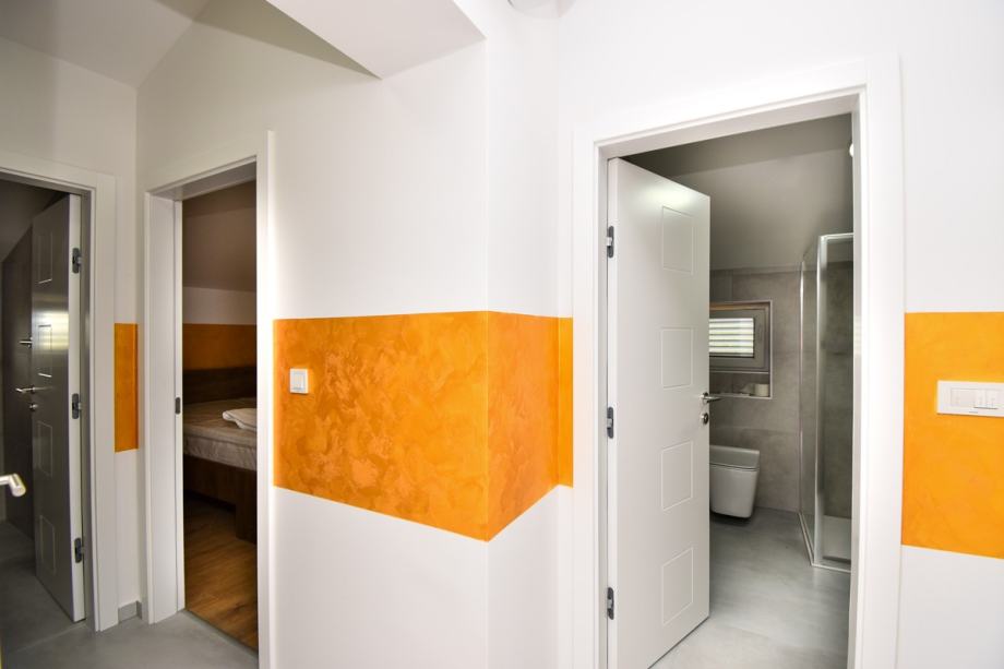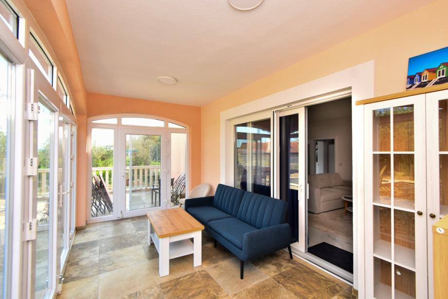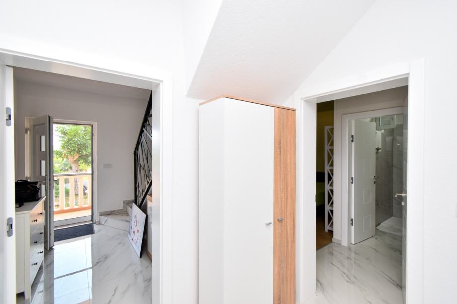 Unutarnjim stepenicama s prekrasnom keramikom i ogradom se dolazi na kat gdje se smjestio još jedan stan površine 118,55 m2, a koji se sastoji od: hodnika s wc-om, 2 spavaće sobe s kupaonicom, predsoblja, radne sobe, ogromnog prostora kuhinje, blagovaonice i dnevnog boravka s izlazom na južnu osunčanu terasu.