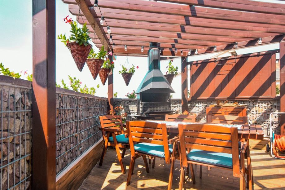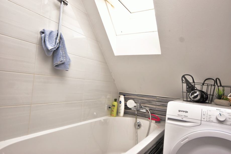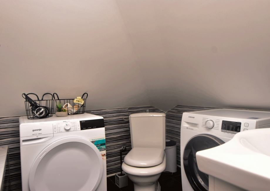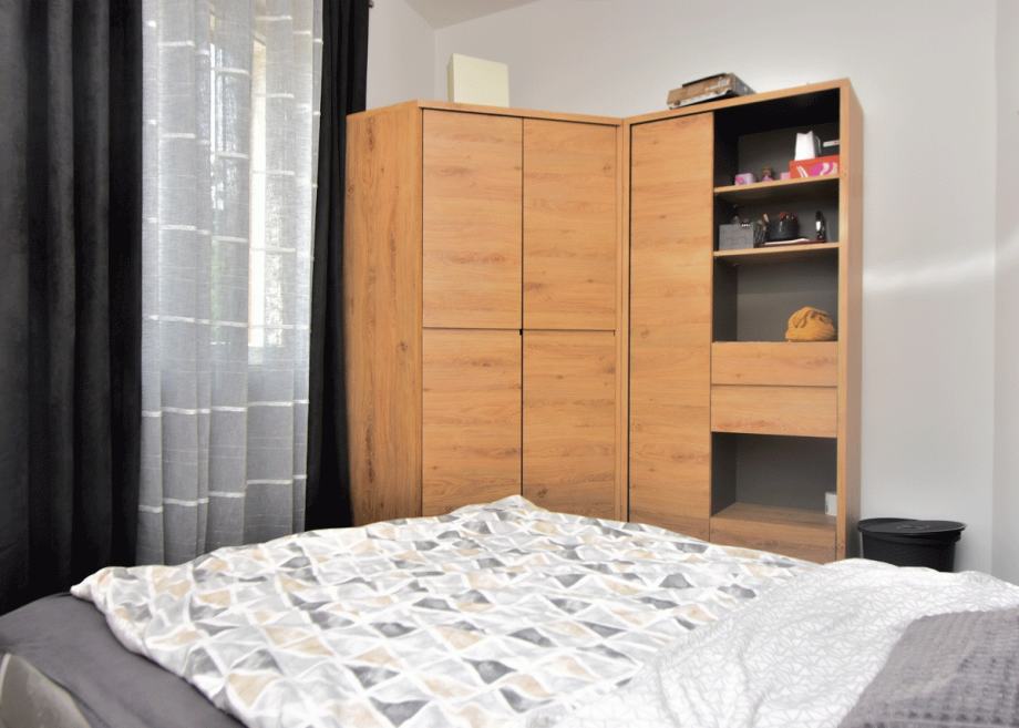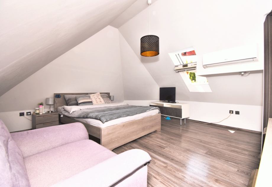 Gornja etaža sastoji se od dvije udobne i svijetle spavaće sobe, druge kupaonice te praktične prostorije s perilicom rublja i sušilicom. Na ovoj etaži nalazi se i izlaz na veliku krovnu terasu natkrivenu sa drvenom pergolom i opremljenu roštiljem, idealnu za opuštanje i druženje sa koje se pruža pogled na šibenski kanal.