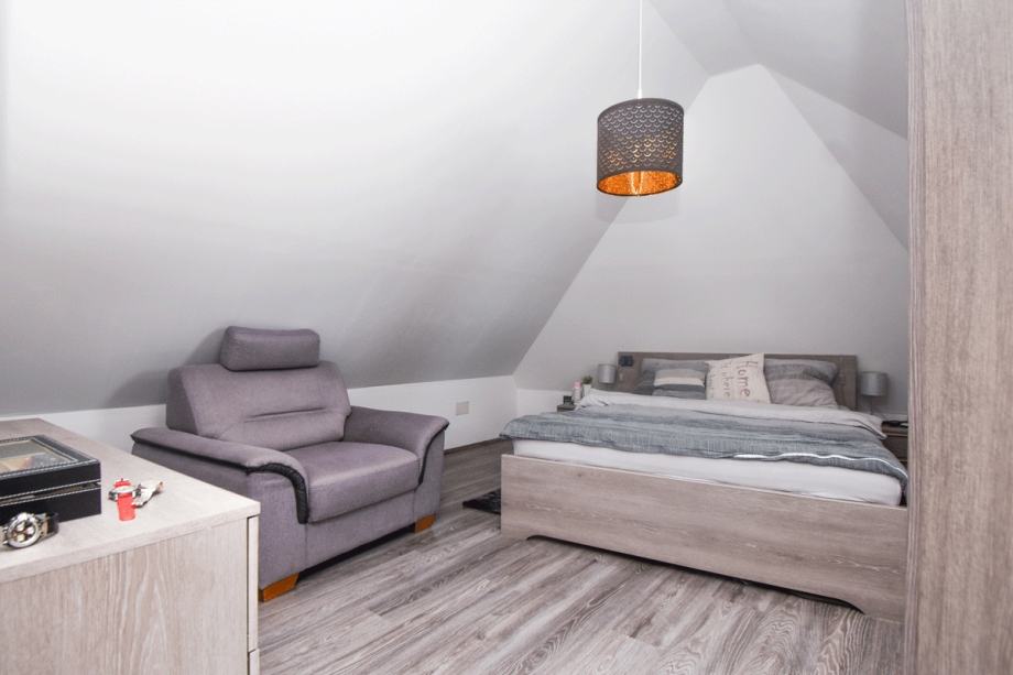 Na prvoj etaži nalazi se prostrano predsoblje s ostavom, spavaća soba s izlazom na balkon s pergolom, te otvoreni prostor u kojem se nalazi dnevni boravak s blagovaonicom i modernom kuhinjom. Na ovoj etaži također je smješteno kupatilo, a iz dnevnog boravka ulazi se u dodatnu spavaću sobu. U dnevnom boravku su diskretno postavljene stepenice koje vode na gornju etažu.