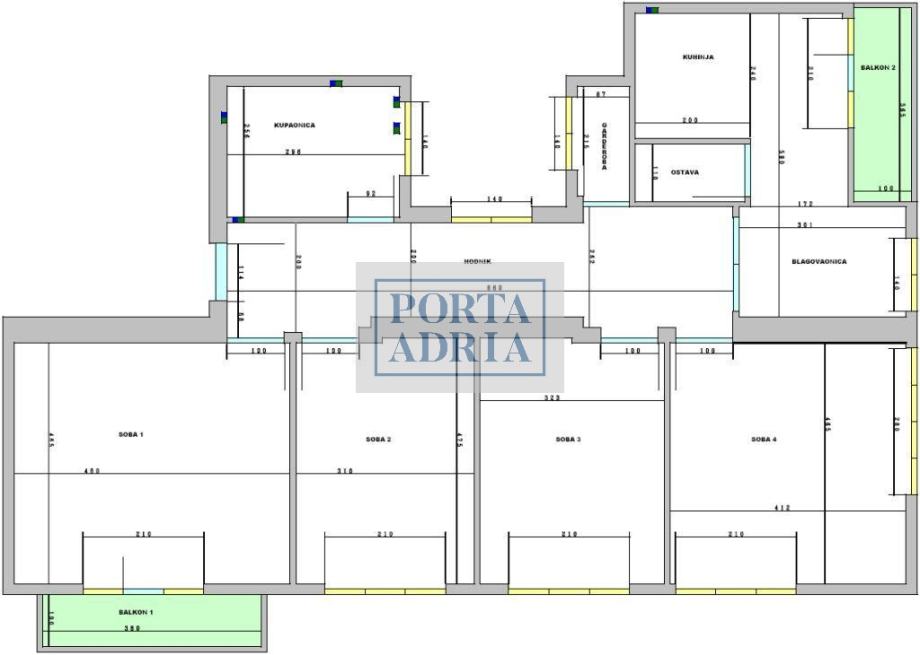 Stan se sastoji od velikog ulaznog dijela, 4 sobe, kuhinje s blagovaonicom, dvije spreme, komforne kupaonice, toaleta i dva balkona.