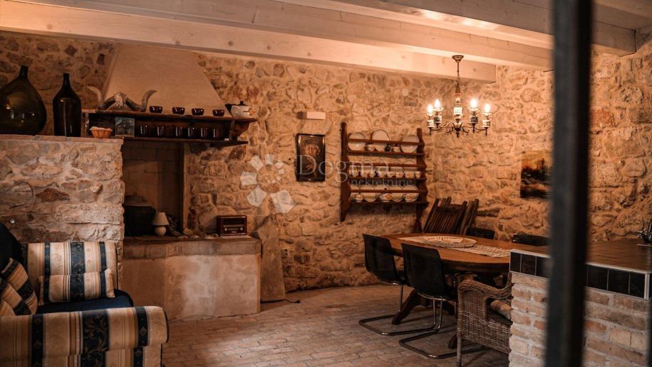 Dnevni boravak: Udoban prostor s renoviranim kaminom, savršen za opuštanje. Podovi su obloženi starim ciglama položenim u betonu, dodajući rustikalni šarm prostoru.