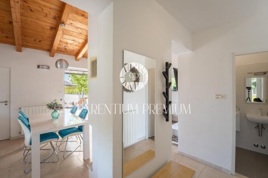 U prizemlju se nalaze spremište, gostinjski WC, jedna spavaća soba s vlastitom kupaonicom, te kuhinja s blagovaonicom i dnevnim boravkom s izlazom na terasu i dvorište u kojem se smjestio bazen sa sunčalištem.