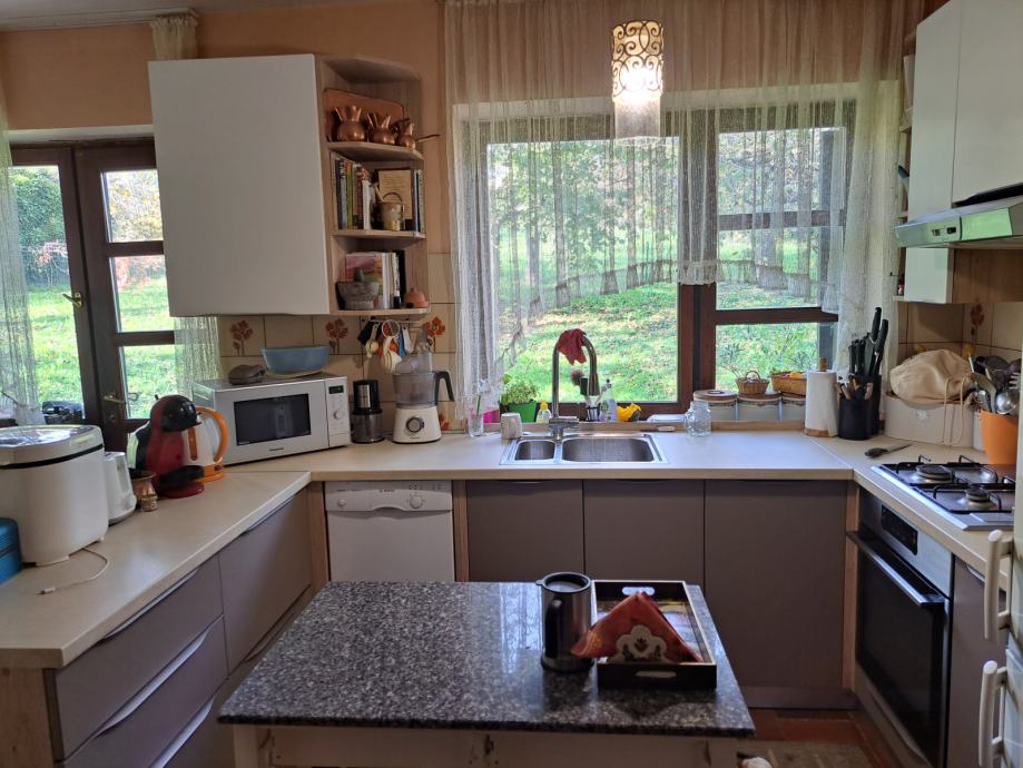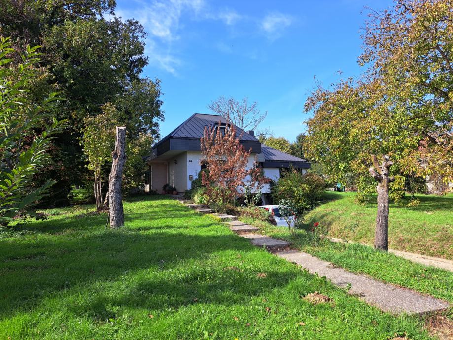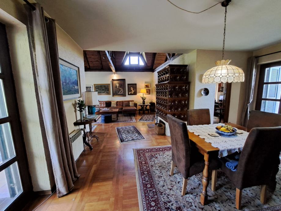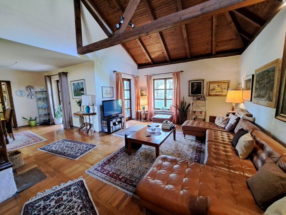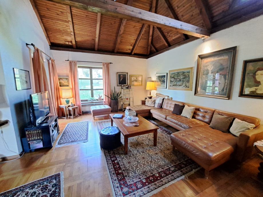 Kuća je građena 1982. godine te je projektirana od nagrađivane arhitektice J. Nosso. Prostran dnevni boravak sa blagovaonicom, visoki stropovi te pristup vanjskim prostorima sa dvije strane pružaju ovom jedinstvenom prostoru puno svjetla.