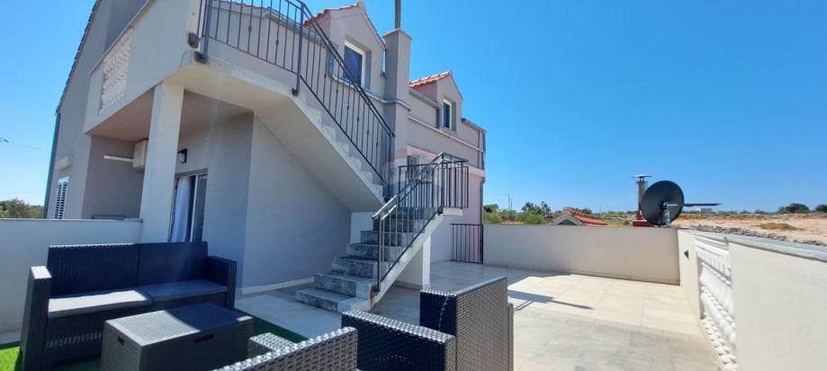 Na prizemlju se nalazi garaža za jedno vozilo površine 18 m2, vanjska ostava površine 11,3 m2, te stan površine 69m2. Stan se sastoji od hodnika, spavaće sobe, dnevnog boravka, kuhinje s blagovaonicom, dvije ostave i natkrivene terase.