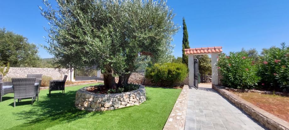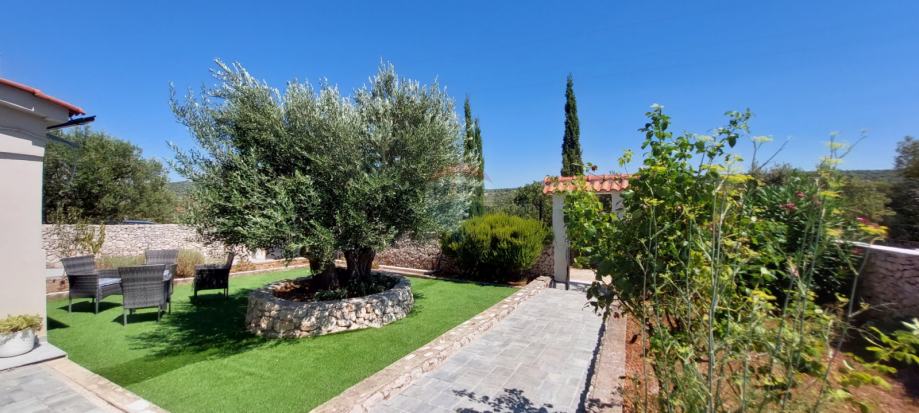 Dvorište je uređeno u mediteranskom stilu s mnogo kamenih detalja, autohtonih mediteranskih biljaka i voćki poput smokve, vinove loze i maslina.