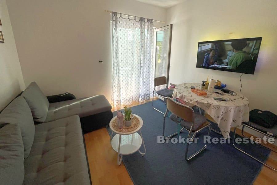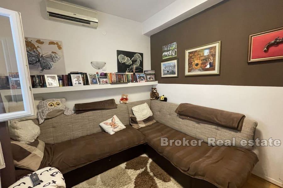 Na drugoj etaži nalazi se manji jednosobni apartman od cca 35m2 i terase od cca 10m2. Te se na istoj etaži nalazi ulaz u dvoetažni stan koji se sastoji od dnevnog boravka i prostrane kuhinje s blagovaonicom te kupaonicom. Unutrašnjim stepenicama se dolazi na drugu etažu stana ,gdje se nalaze tri spavaće sobe i velika terasa s pogledom na more i grad od cca 40m2.