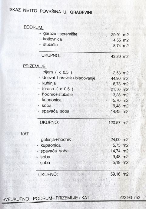 Kuća veličine 223 m2 sastoji se od podruma , prizemlja i kata.