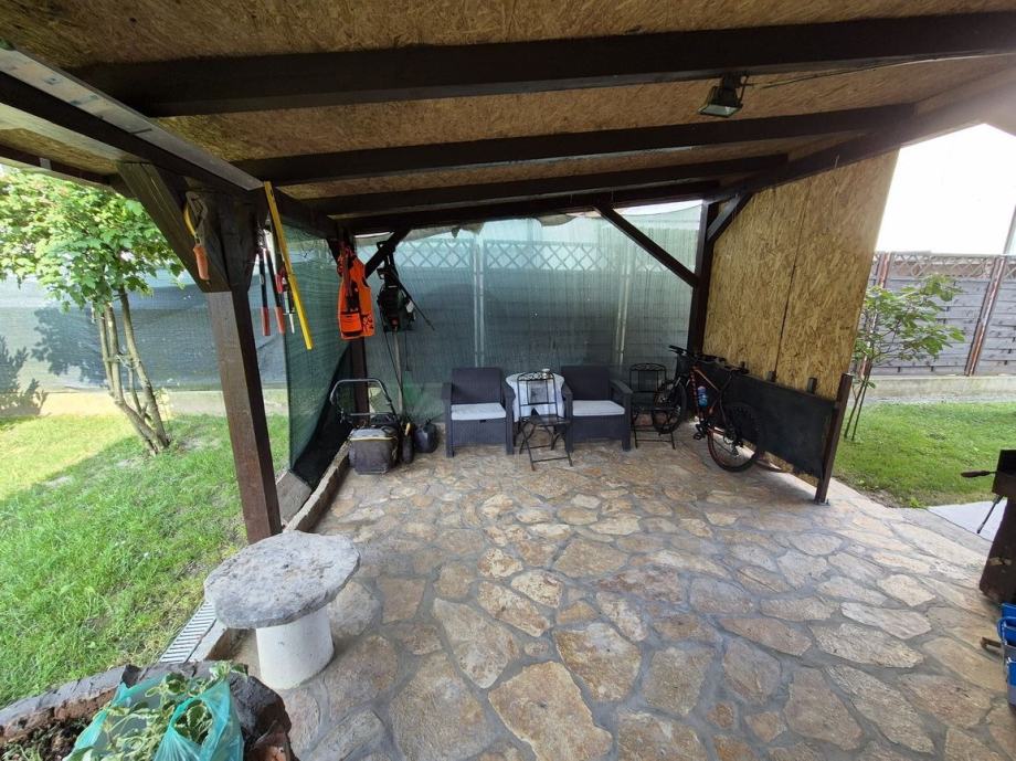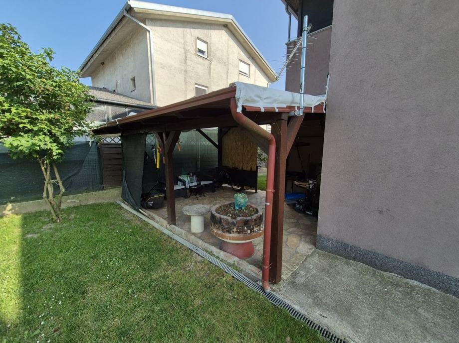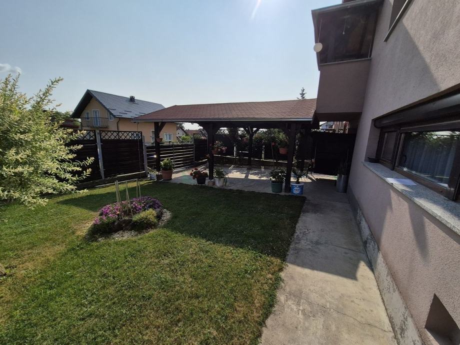 Okućnica uređena, s malim vrtom i parkirnim mjestom pod nadstrešnicom.